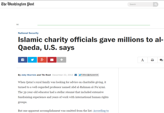 Camstoll’s work with the Post‘s Warrick also proved quite productive. Camstoll spoke with Warrick on December 17, 2013. The very next day, the Post reporter published an article stating that “private Qatar-based charities have taken a more prominent role in recent weeks in raising cash and supplies for Islamist extremists in Syria, according to current and former U.S. and Middle Eastern officials.”